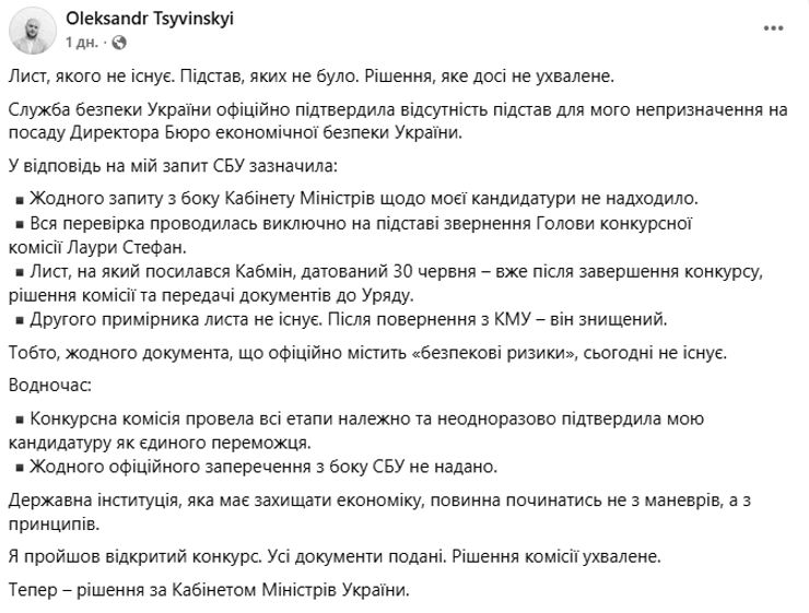 Днем ранее руководитель третьего подразделения детективов Второго Главного подразделения НАБУ Александр Цивинский отмечал, что СБУ не нашла никаких оснований для неназначения его на пост главы БЭБ.