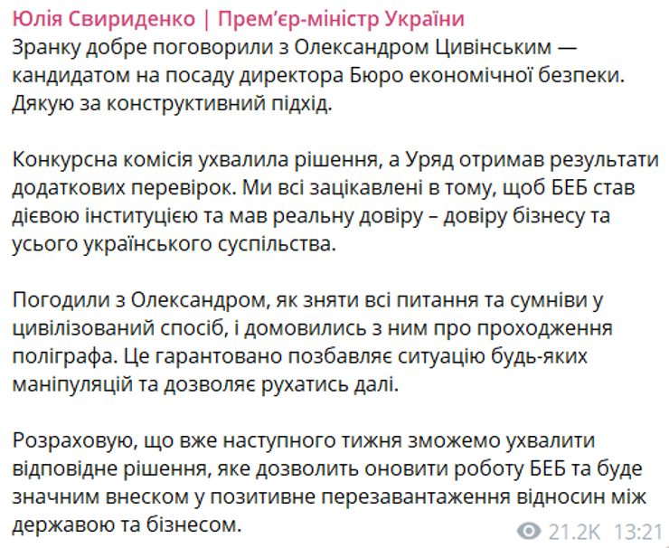 Свириденко добавила, что договорилась с ним о прохождении полиграфа.