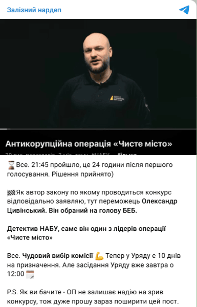 30 июля комиссия по отбору директора БЭБ провела онлайн-конференцию, где сообщила, что завершает свои полномочия, потому что провела отбор и определила победителя конкурса – Александра Цивинского.Там отметили, что не будут проводить повторный конкурс, ведь Цивинский полностью отвечает требованиям по должности директора БЭБ, предусмотренным действующим законодательством.