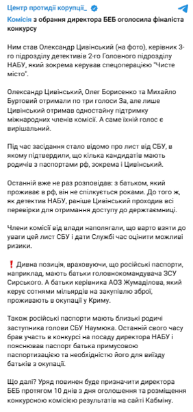 24 июня Центр противодействия коррупции сообщил, что БЭБ объявило детектива НАБУ Александра Цивинского победителем конкурса на главу БЭБ. Он получил единодушную поддержку международных членов комиссии, голос которых имеет решающее значение.