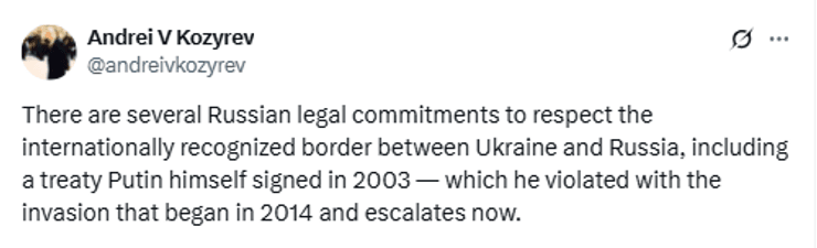 "Существует несколько российских правовых обязательств уважать международно признанные границы между Украиной и Россией, в том числе договор, подписанный самим Путиным в 2003 году, который он нарушил вторжением, начавшимся в 2014 году и усиливающимся сейчас", — написал он.