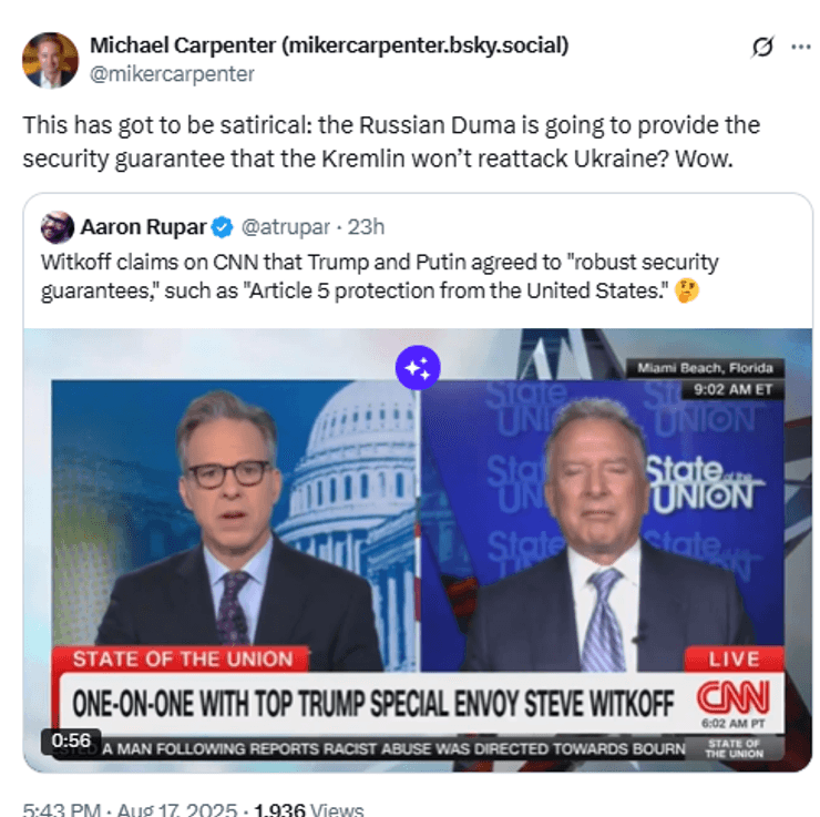 На данный момент большинство аналитиков сходятся во мнении, что даже если Путин и высказался в поддержку идеи гарантий безопасности во время саммита на Аляске, российский президент вряд ли будет готов согласиться на что-то подобное защите, предоставляемой НАТО, после того как три года боролся именно против этого.