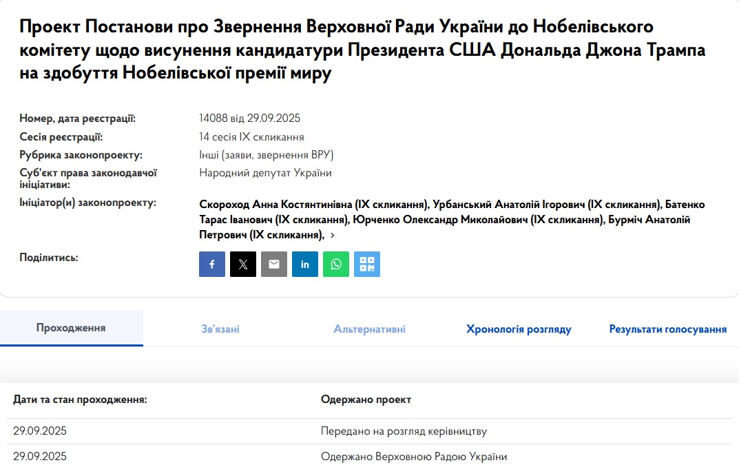 Пятеро народных депутатов зарегистрировали в Верховной Раде Украины проект постановления по обращению в Нобелевский комитет, чтобы выдвинуть американского президента Дональда Трампа на Нобелевскую премию мира.