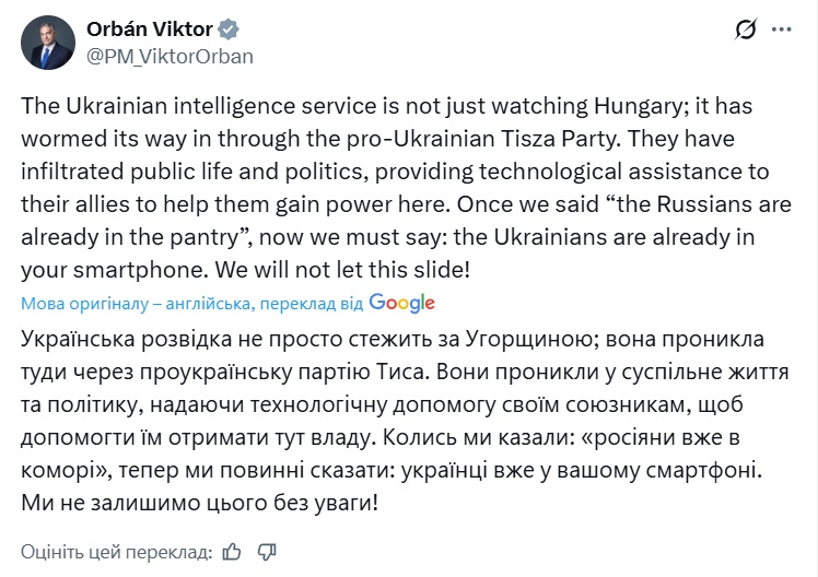 "Они внедрились в общественную жизнь и политику, оказывая технологическую поддержку своим союзникам, чтобы помочь им прийти к власти. Когда-то мы говорили: "Русские уже в кладовке". А теперь нужно сказать: украинцы уже в вашем смартфоне. Мы этого так не оставим!" — написал Орбан в своем аккаунте на Х.