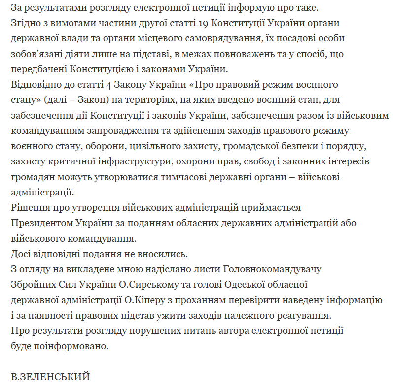 Ответ президента на петицию о создании Одесской городской военной администрации был опубликован 14 октября. Владимир Зеленский отметил, что решение о создании военных администраций президент Украины может принять по представлению областных государственных администраций или военного командования.