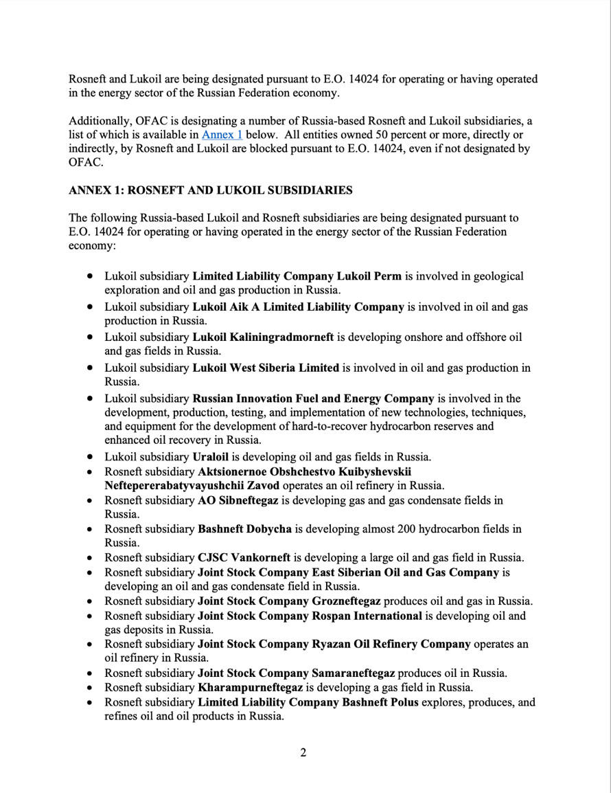 Кроме того, сообщается, что в новые санкционные списки США включен ряд дочерних компаний "Роснефти" и "Лукойла". Туда попали те компании, принадлежащие к указанным гигантам, "на 50% или более, прямо или косвенно".