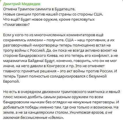 "Если у кого-то из многочисленных комментаторов еще сохранялись иллюзии — получите. США — наш противник, а их болтливый "миротворец" теперь полноценно стал на тропу войны с Россией. Да, он пока не всегда активно воюет на стороне Бандеровского Киева, но это теперь его конфликт, а не маразматика Байдена!", — подчеркнул заместитель председателя Совета безопасности России.
