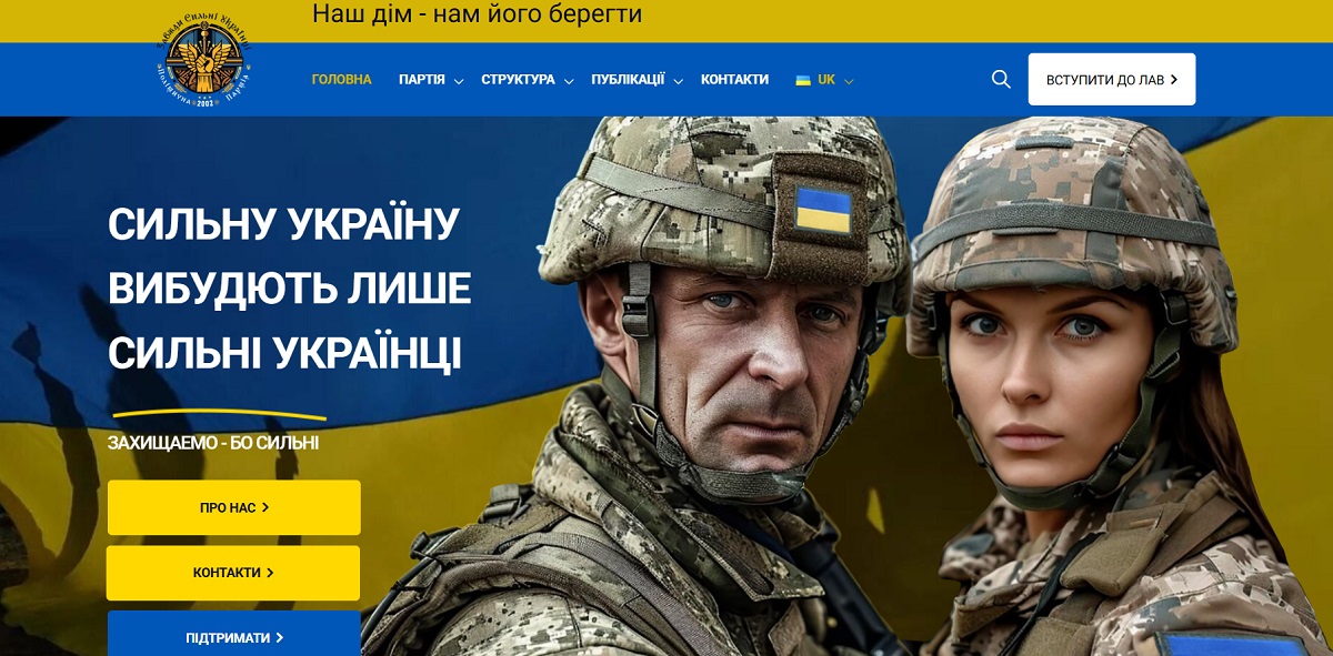 Сайт партии "Всегда сильные украинцы" с красноречивой гиперссылкой zsu.in.ua. На главной странице несколько слоганов для привлечения внимания: "Мы создаем партию лидеров, а не подставку для вождя", "Сильную Украину выстроят только сильные украинцы" (этот лозунг дополнен фотографией мужчины и женщины в военной форме).