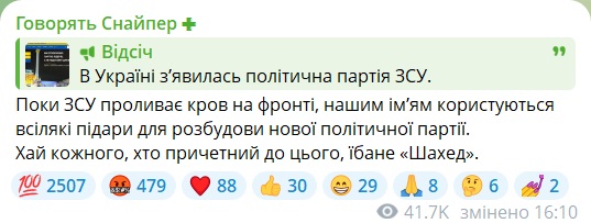 Между тем на создание партии "ВСУ" уже отреагировал военный Станислав Бунятов с позывным "Осман", который отметил, что пока "ВСУ проливает кровь на фронте, нашим именем пользуются всевозможные п***ы для развития новой политической партии".