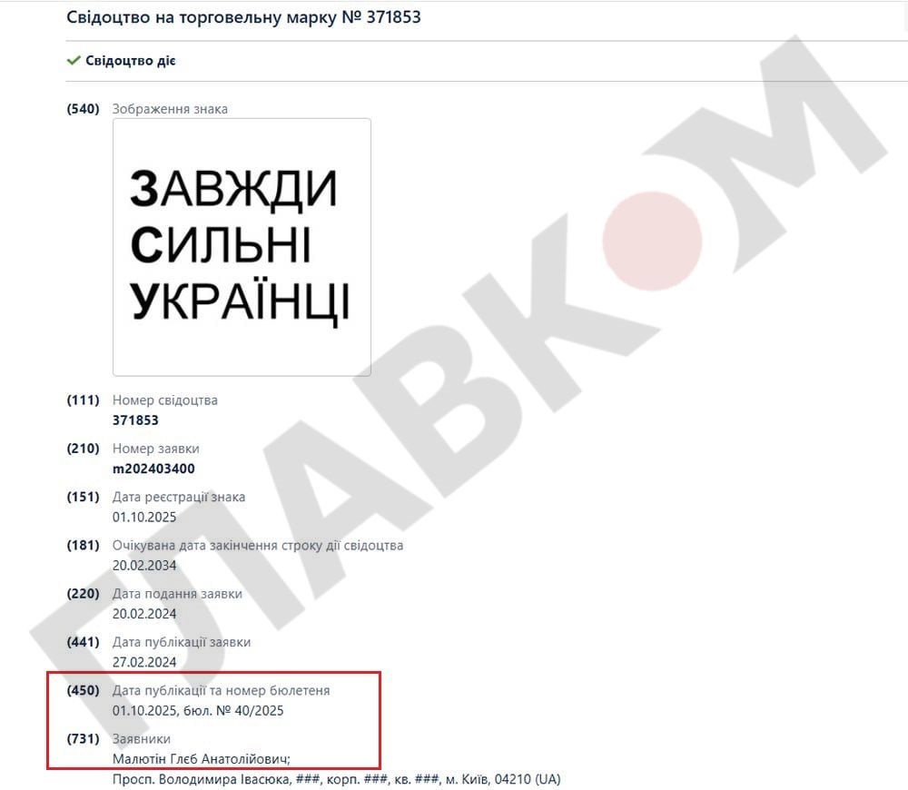 Новый партийный босс не ограничился лишь изменением названия политической силы: через государственный реестр торговых марок он закрепил за собой название "Всегда сильные украинцы". При этом заявитель Малютин прицельно сделал акцент на аббревиатуре, которую создают первые буквы слов, из которых состоит новое название. При регистрации торгового знака заявитель выделил жирным первые буквы слов торговой марки, чтобы сомнений не оставалось: в Украине теперь есть "ЗСУ".