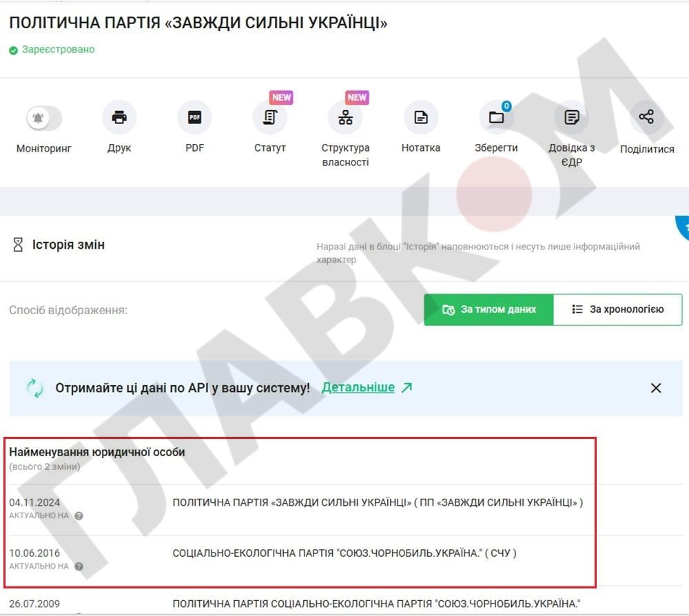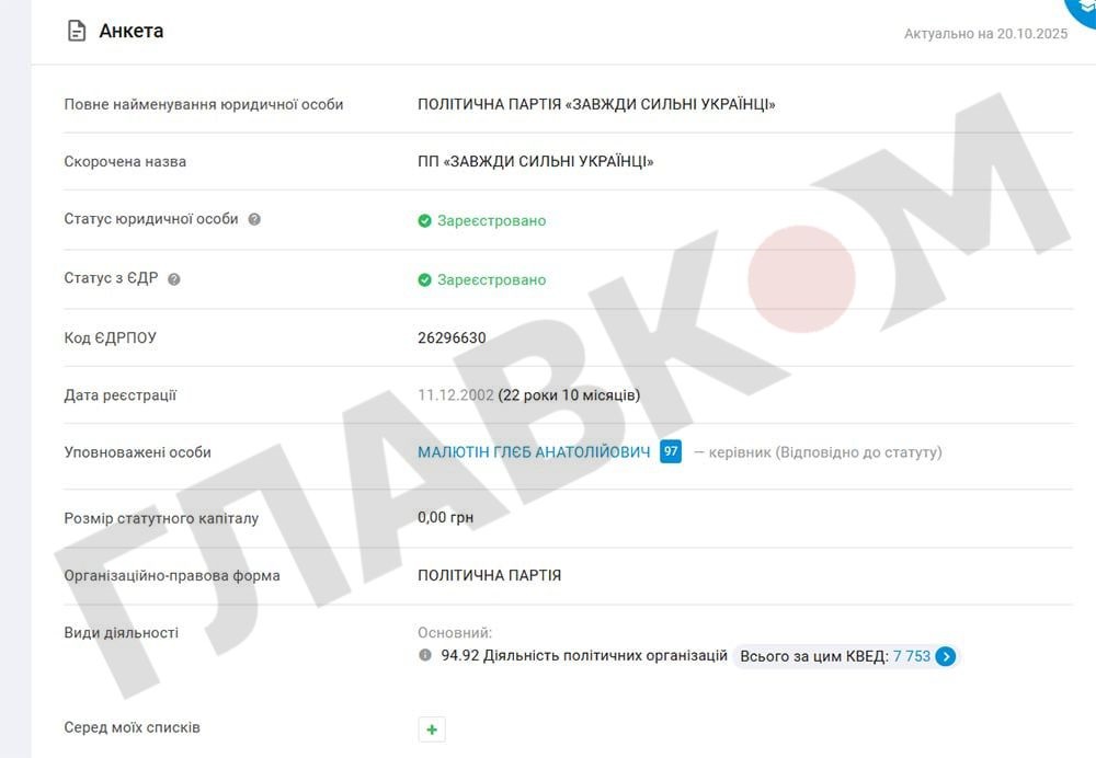 Это не новая партия, а социально-экологическая партия "Союз. Чернобыль. Украина" под новым названием. Партию "Всегда сильные украинцы", сокращенно "ВСУ", возглавил Глеб Малютин, бывший советник вице-премьера Алексея Кулебы.