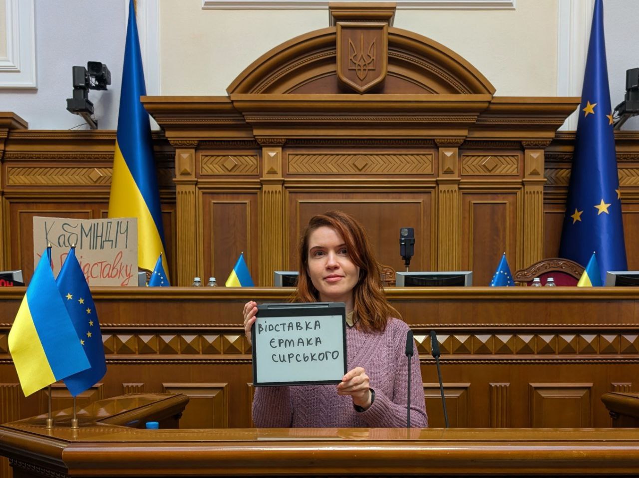 Также на трибуне появилась Марьяна Безуглая с призывом отправить в отставку Андрея Ермака, а также главнокомандующего ВСУ Александра Сырского.