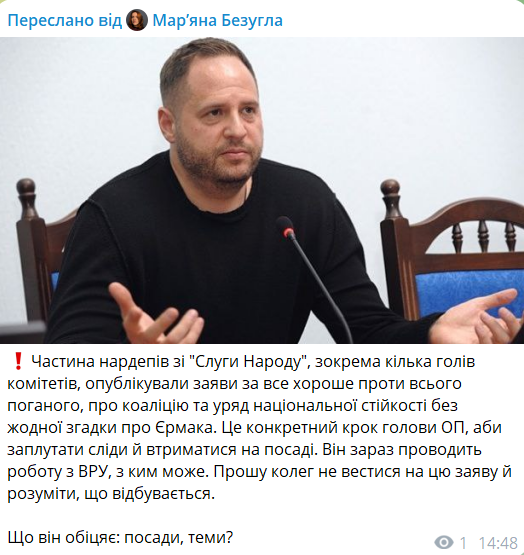 "Часть нардепов из "Слуги Народа", в том числе несколько глав комитетов, опубликовали заявления за все хорошее против всего плохого, о коалиции и правительстве национальной стойкости без упоминания Ермака. Это конкретный шаг главы ОП, чтобы запутать следы и удержаться в должности. Он сейчас проводит работу по ВРУ, с кем может. Прошу коллег не вестись на это заявление и понимать, что происходит. Что он обещает: должности, темы?"