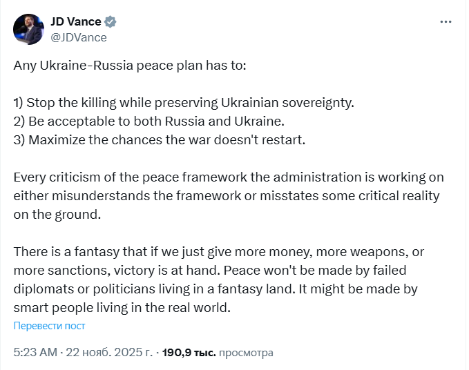 "Существует иллюзия, что если мы просто предоставим больше денег, больше оружия или больше санкций, победа будет близко. Мир не будет достигнут неудачными дипломатами или политиками, которые живут в мире иллюзий. Он может быть достигнут умными людьми, которые живут в реальном мире", — подчеркнул Вэнс.