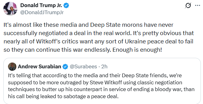 "Похоже, эти СМИ и идиоты из Глубинного государства никогда не добивались успеха в переговорах в реальном мире. Совершенно очевидно, что почти все критики Уиткоффа хотят провала любого мирного соглашения с Украиной, чтобы продолжать эту войну бесконечно. Хватит!" – гласит пост Трампа-младшего.