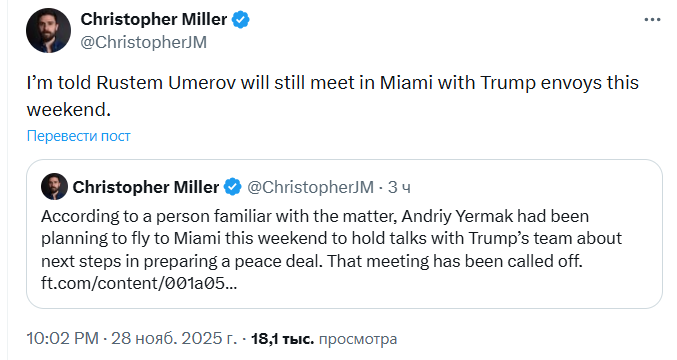 "Мне сообщили, что Рустем Умеров все же встретится в Майами с посланцами Трампа в этот уикенд", — подчеркнул журналист.