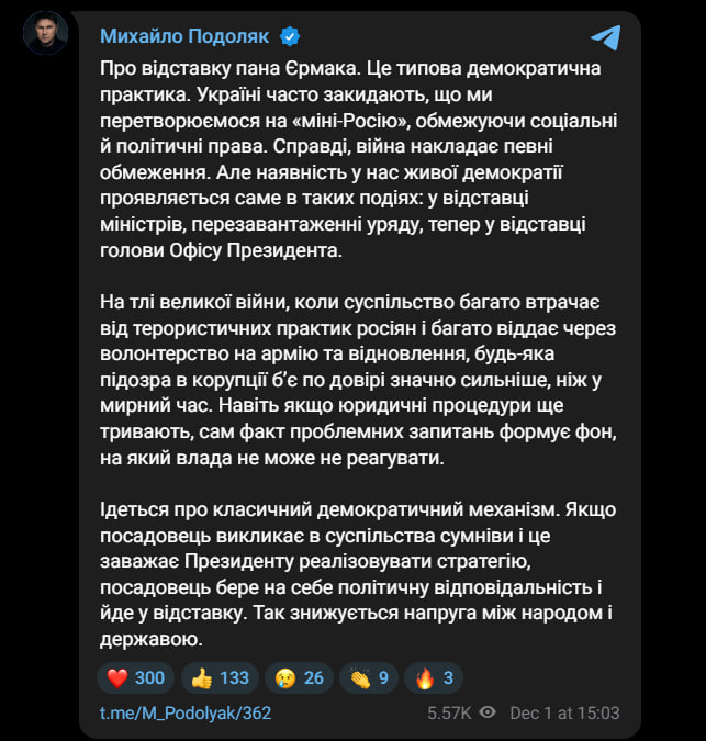 Советник главы Офиса президента Михаил Подоляк прокомментировал отставку Андрея Ермака, подчеркнув, что это является нормальным демократическим процессом. Он отметил, что такие шаги помогают сохранять доверие граждан даже в условиях войны.