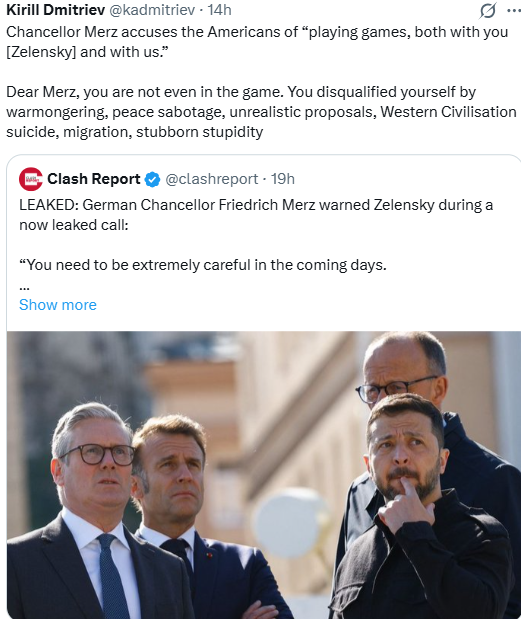 Спецпредставитель президента России по инвестиционно-экономическому сотрудничеству с зарубежными странами Кирилл Дмитриев раскритиковал канцлера Германии Фридриха Мерца после того, как СМИ обнародовали якобы детали тайных телефонных переговоров европейских лидеров и президента Украины Владимира Зеленского.