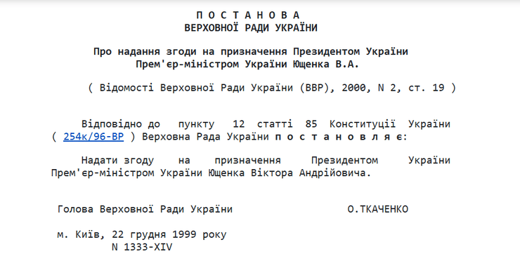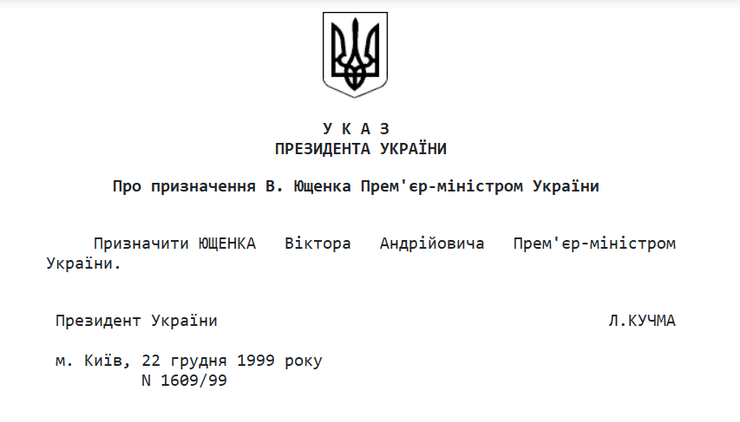 22 декабря 1999 года второй президент Украины Леонид Кучма подписал указ о назначении Виктора Ющенко, который в то время был главой Национального банка Украины, на пост премьер-министра. Его поддержади 296 народных депутатов.