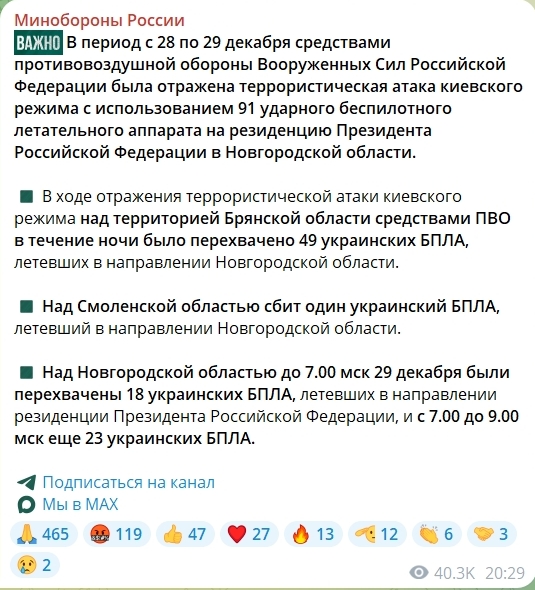 Но после заявления Кремля Минобороны РФ выпустило более загадочное сообщение, в котором утверждается, что в период с 28 по 29 декабря средствами противовоздушной обороны Вооруженных Сил Российской Федерации "была отражена террористическая атака киевского режима с использованием 91 ударного беспилотного летательного аппарата на резиденцию Президента Российской Федерации в Новгородской области".