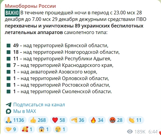 При этом ранее Министерство обороны РФ сообщало об атаке дронов, но заявило, что всего за ночь сбили 89 дронов, в том числе над Новгородской областью — 18.