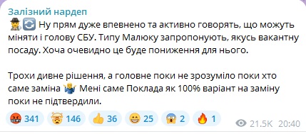 "Очень уверенно и активно говорят, что могут менять и главу СБУ. Типа Малюку предложат, какую-то вакантную должность. Хотя очевидно это будет понижение для него. Немного странное решение, а главное пока не понятно пока, кто именно замена. Мне именно Поклада как 100% вариант на замену пока не подтвердили", — написал Железняк.