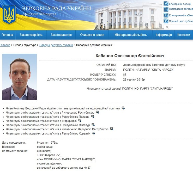 На момент избрания в парламент Кабанов работал сценаристом Студии "Квартал 95", а в парламенте – членом Комитета ВРУ по вопросам гуманитарной и информационной политики.