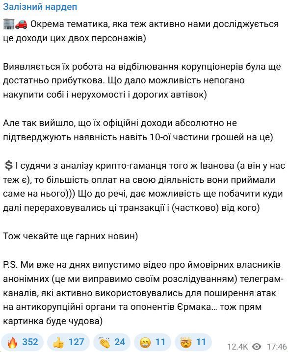 Также Железняк анонсировал видео о вероятных владельцах анонимных Telegram-каналов, которые "активно использовались для распространения атак на антикоррупционные органы" и оппонентов бывшего руководителя Офиса президента Украины Андрея Ермака.