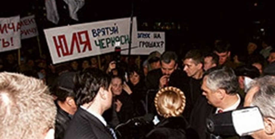 Город встретил Юлию Тимошенко не то митингом, не то пикетом возле стен областного совета, где вот-вот должна была начаться внеочередная сессия городского совета с участием лидера БЮТ. Предоставить свои рабочие места городским депутатам их областные коллеги решили потому, что помещение горсовета просто бы не уместило всех желающих попасть на сессию. На то, как Тимошенко будет "наводить порядок" в Черкассах, прибыл посмотреть внушительный десант столичной прессы, с образовательной целью явились активисты БЮТ из соседних Кировоградской и Полтавской областей, не говоря уже о том, что собрался весь местный политбомонд во главе с черкасским губернатором Александром Черевко и председателем облсовета Владимиром Гресем. Пикетчики же разделились на две группы. Одна держала аккуратно изготовленные транспаранты, призывающие к импичменту мэра Черкасс Сергея Одарыча. Другая часть развернула ватманы, на которых гуашью были выведены лозунги, изобличающие "предателей" БЮТ — народных депутатов Богдана Губского и Владимира Олийныка. К слову, и те, и другие митингующие стояли под бело-красными "сердечными" стягами Блока Юлии Тимошенко.