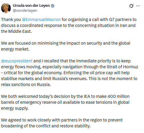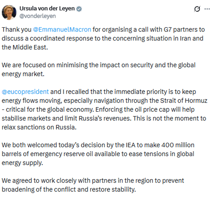 В ответ на такое решение Дмитриев уже заявил, что "Урсула – киллер экономики", имея в виду председателя Европейской комиссии Урсулу фон дер Ляйен. После совещания она написала, что потолок цен на российскую нефть, введенный европейскими странами, "поможет стабилизировать рынки и ограничить доходы России".