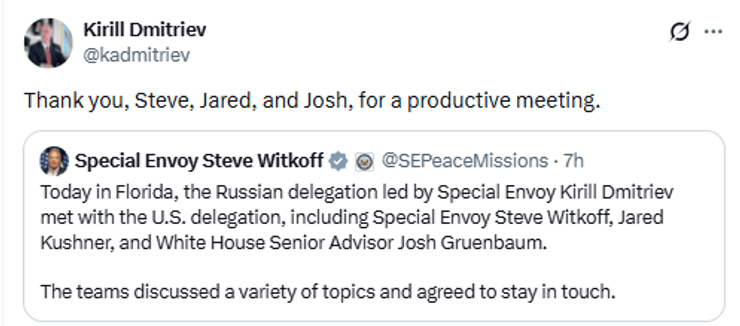 В свою очередь Дмитриев репостнул публикацию Уиткоффа.