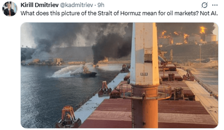 "Что означает эта фотография Ормузского пролива для нефтяных рынков?" — подписал Дмитриев, уточнив, что кадр реальный, а не созданный искусственным интеллектом.
