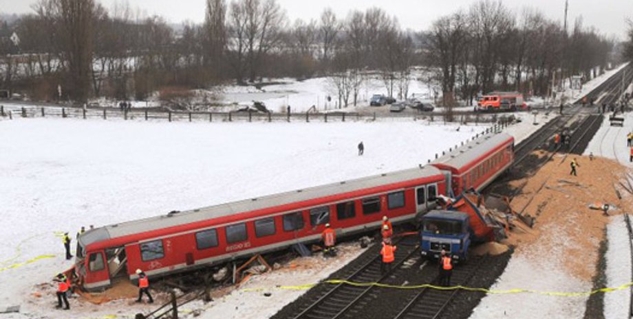 В Германии электричка столкнулась с грузовиком и сошла с рельс. В результате ДТП 16 человек получили ранения.