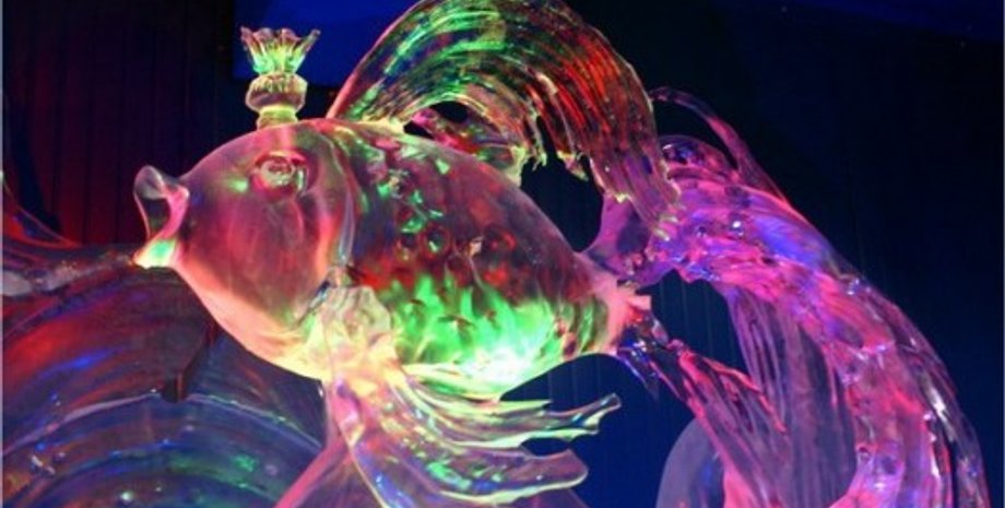 Около входа выставили 8 полуметровых ледяных скульптур — трон, который по вечерам подсвечивается изнутри, лев, моллюск, две елочки и три абстракции.