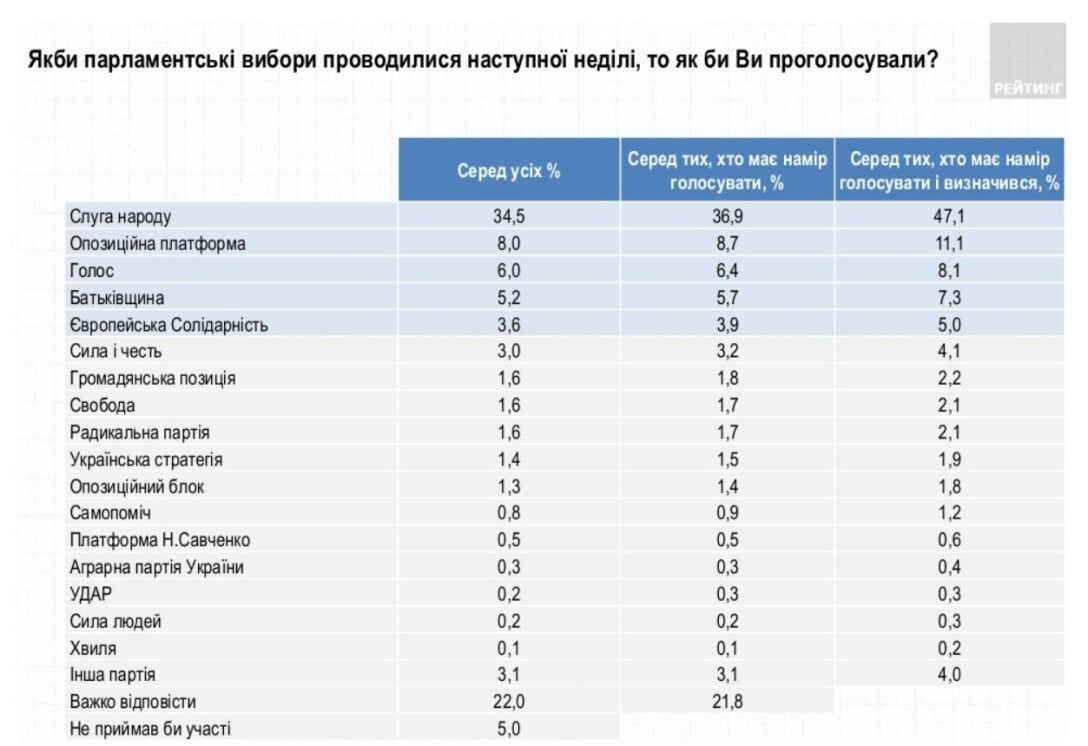 Слуга народа сохраняет лидерство, Голос выходит на третье место, – опрос "Рейтинга"