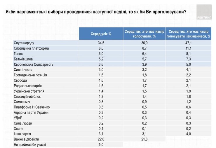 - Согласно данным соцпроса "Рейтинга", который проводился с 6-9 июня, партию "Слуга народа", поддерживали 47,5% тех, кто намерен голосовать и определился с выбором. За "Оппозиционную платформу - За жизнь" тогда готовы были проголосовать 10,4% определившихся, за "Европейская Солидарность" – 7,9%, за ВО "Батькивщина" – 7,5%, за партию "Голос" – 6,4%.