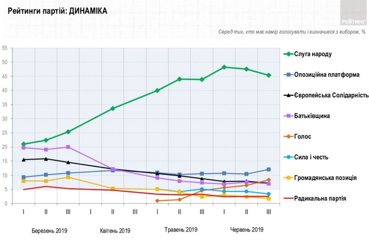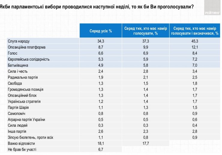 - Согласно данным соцпроса "Рейтинга", который проводился с 8-12 июня, партию "Слуга народа", поддерживали 47,1% тех, кто намерен голосовать и определился с выбором. За "Оппозиционную платформу – За жизнь" тогда готовы были проголосовать 11,1% определившихся, за "Голос" – 8,1%, за ВО "Батькивщина" – 7,3%, а за "Европейскую Солидарность" – 5,0%.