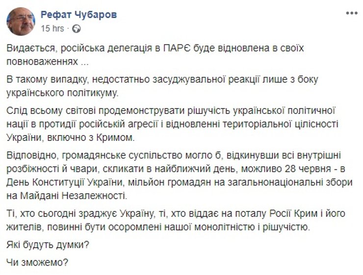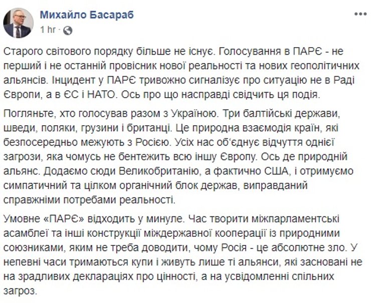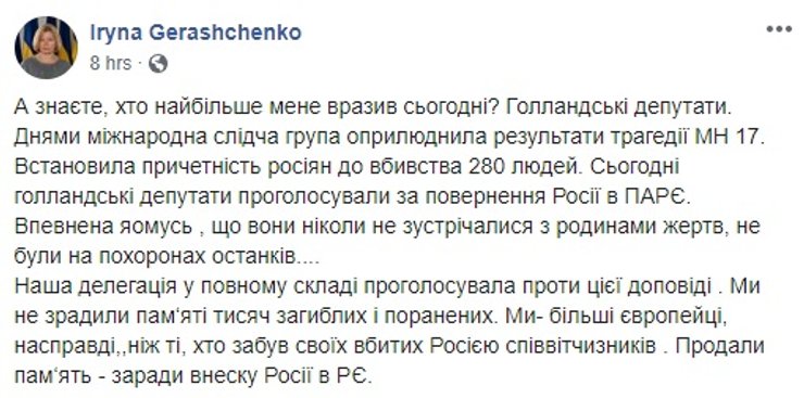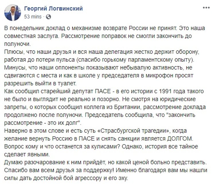 "В 2017 году Россия полностью приостановила уплату взносов в бюджет Совета Европы. В общей сложности, это около €33 млн в год. В организации начались проблемы с оплатой счетов. И ровно в этот момент в Ассамблее заговорили о необходимости возвращения России в состав ПАСЕ. Российские санкции "наказания рублем" оказались сильнее европейских ценностей и пафосных выступлений евроделегатов", — написал депутат в Facebook.