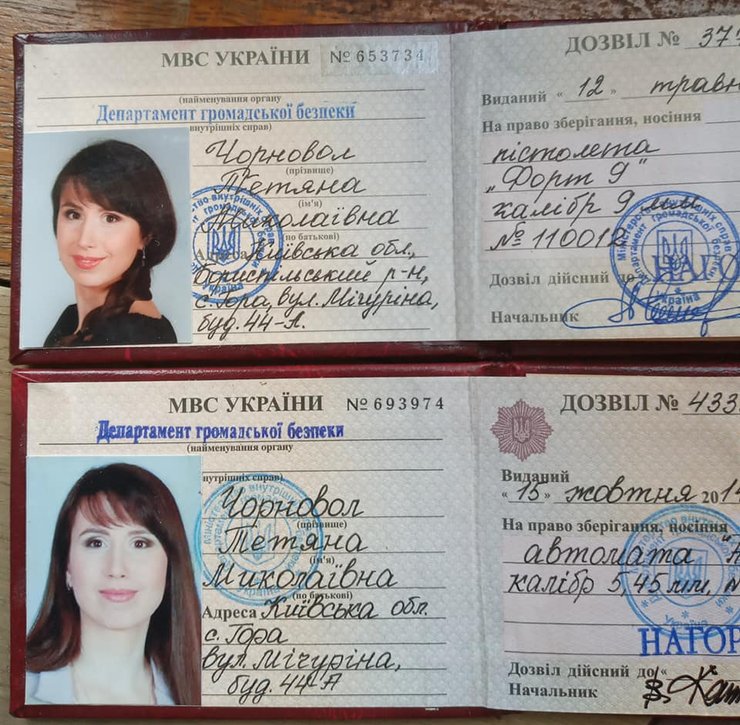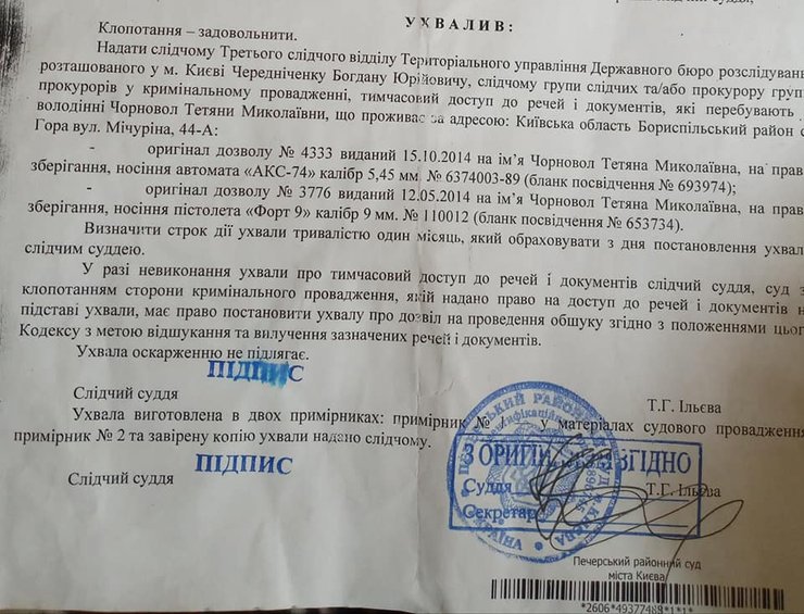 В постановлении говорится, что суд предоставил временный доступ к вещам и документам, которые находятся во владении Черновол, а именно: к оригиналу разрешения №4333, выданного 15 октября 2014 на имя Татьяны Черновол, на право хранения, ношения автомата "АКС-74" калибром 5, 45 мм №63 74003-89 (бланк удостоверения №693974), а также – к оригиналу разрешения № 3776, выданного 12 мая 2014 на имя Татьяны Черновол, на право хранения, ношения пистолета "Форт 9" калибром 9 мм, №110012 (бланк удостоверения № 653734).
