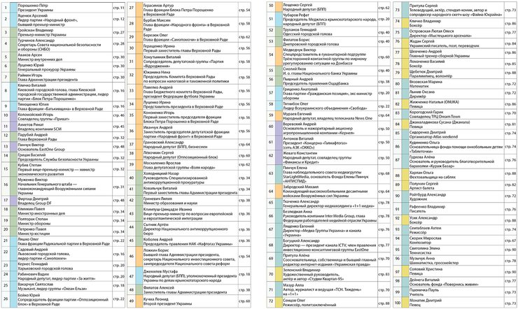 В течение многих лет до Революции достоинства список 100 самых влиятельных украинцев практически не менялся. Большинство из них, вероятно, даже не знали друг друга, но при случае могли найти общий язык. Последние три года все изменили. Об идеалах Майдана власть больше не вспоминает, свобода слова по-прежнему нарушается, а борьба с коррупцией с подачи все той же власти превратилась в фарс — чем не повод еще больше нас всех разделить? В список влиятельнейших украинцев вошли не только заклятые враги президент Петр Порошенко и лидер "Батькивщины" Юлия Тимошенко, но также директор НАБУ Артем Сытник с главой Антикоррупционной прокуратуры Назаром Холодницким, за спинами которых мощной броней стоят ЕС и США. Есть несколько человек, влиятельность которых — предмет жарких дискуссий. Среди них лидер партии "Свобода" Олег Тягнибок, народный депутат, жена генпрокурора Ирина Луценко и даже глава Администрации президента Игорь Райнин. У каждого немало сторонников и критиков. Но все они — участники бурных событий этого года.