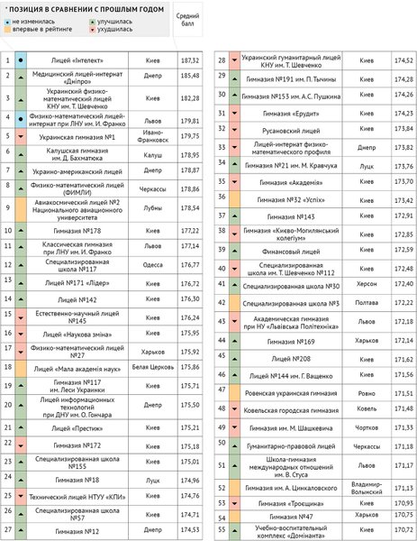 При этом пятерка лидеров осталась фактически неизменной. Четыре учебных заведения из предыдущего топ-5 школ удержали первенство. Первое место, как и ранее, занял киевский лицей "Інтелект", опередив ближайших конкурентов минимум на 2 балла. 35 школ поднялись в рейтинге, 33 — ухудшили свои позиции в сравнении с 2016 годом. В рейтинг не попала Винницкая область, зато появились Сумская и Хмельницкая. Количество школ Киева сократилось, в то время как число харьковских выросло почти вдвое.