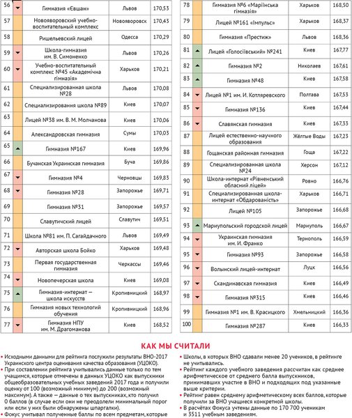 Методология отбора была такой же, как и в прошлом году. Это дало нам возможность впервые проследить динамику школьного образования. Результаты оказались интересными. Рейтинг обновился на 30%, следовательно, пополнился 30 новыми школами. Например, Владимир-Волынская гимназия им. А. Цинкаловского поднялась на 470 пунктов: учителя и ученики вывели ее с 522-го места в 2016 году на 52-е в 2017-м. Если в 2016-м в рейтинг вошли школы в основном из крупных городов, то в 2017-м высокие конкурентные знания продемонстрировали, например, выпускники из пгт Гоща Ровенской области — 88-е место в списке лучших.