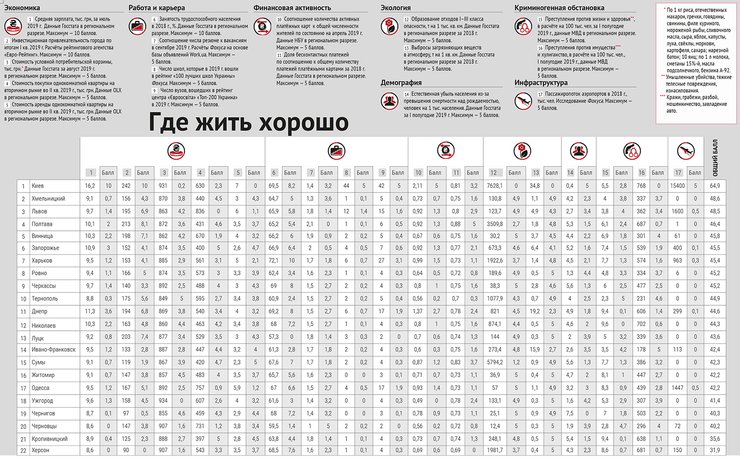 - 25 баллов город мог получить за легкость поиска работы и возможности для образования. Учитывались такие критерии, как уровень занятости среди населения трудоспособного возраста (10 баллов), соотношение резюме к вакансиям (5 баллов), число школ, вошедших в 2019 году в рейтинг Фокуса "Топ-100 лучших школ" (5 баллов), и число вузов, вошедших в рейтинг "Топ-200 Украина" (5 баллов).