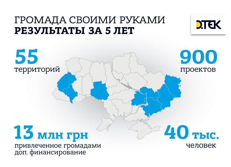 "Громада своими руками" растет и расширяется: в первый год в конкурсе принимали участие 18 территорий, в 2018 году —55 в 7 областях Украины. За это время ДТЭК вовлек в процесс активных преобразований в общей сложности более 40 тысяч человек. На данном этапе к инициативе компании присоединились местные власти и некоммерческие организации.