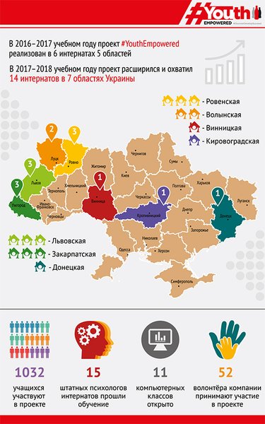 — В 2017–2018 учебном году проект #YouthEmpowered расширился и охватил 14 интернатов в семи областях Украины (Ровенской, Волынской, Донецкой, Винницкой, Кировоградской, Львовской и Закарпатской), год назад мы работали в шести интернатах пяти областей. То есть проект уже охватил в два раза больше учебных заведений.