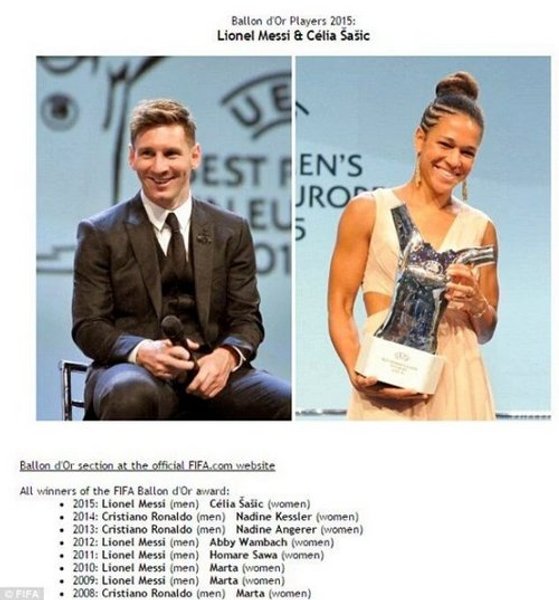 Благодаря системному сбою на официальном сайте организации появилось сообщение с именем лауреата 2015 года. Им стал форвард каталонской "Барселоны" и сборной Аргентины Лионель Месси.