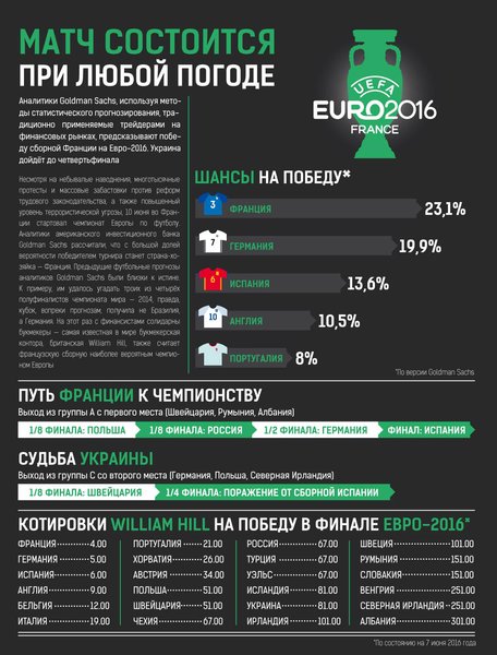 Аналитики Goldman Sachs, используя методы статистического прогнозирования, традиционно применяемые трейдерами на финансовых рынках, предсказывают победу сборной Франции на Евро-2016. Украина дойдет до четвертьфинала
