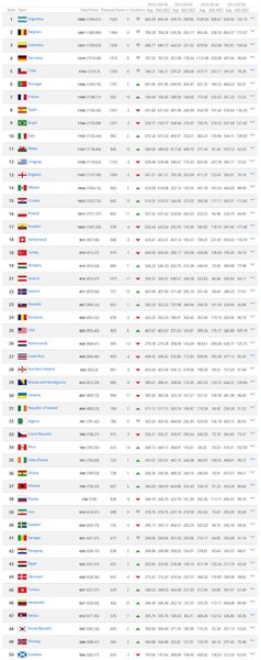 Первая пятерка рейтинга не претерпела изменений. На первом месте по-прежнему находится сборная Аргентины, далее следуют Бельгия, Колумбия, Германия и Чили.