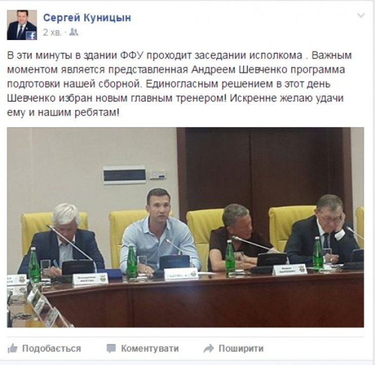 В киевском Доме футбола состоялось заседание исполкома Федерации футбола Украины, на котором было принято решение назначить главным тренером сборной Украины Андрея Шевченко. Об этом на своей странице в Facebook написал член исполкома Сергей Куницын.
