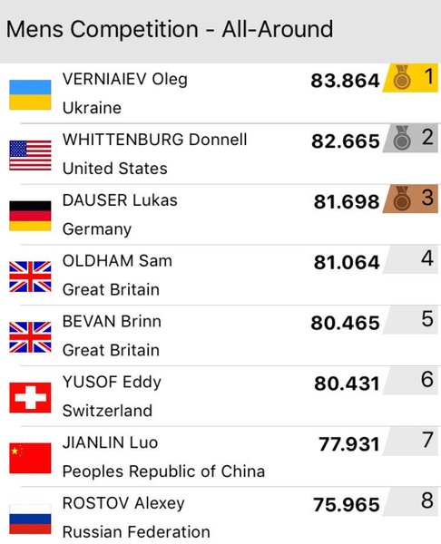 На соревнованиях в Лондоне украинец показал результат в сумме многоборья 83,864 балла.